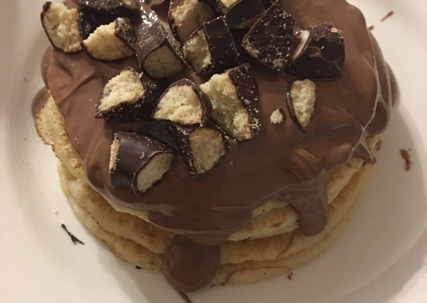 - Una vez que esté el chocolate completamente derretido, lo verteremos sobre las tortitas y coronaremos con un topping, en este caso filipinos.